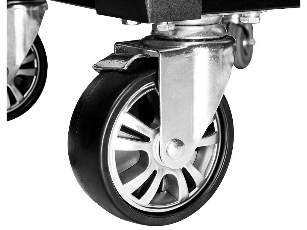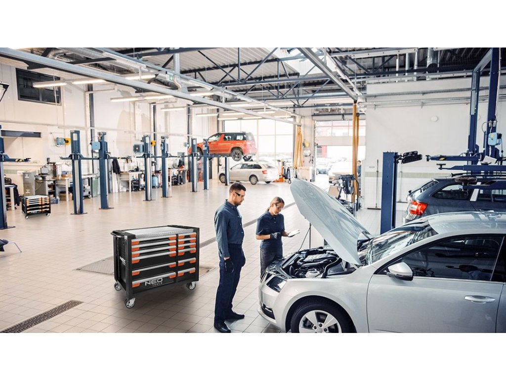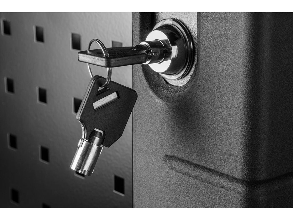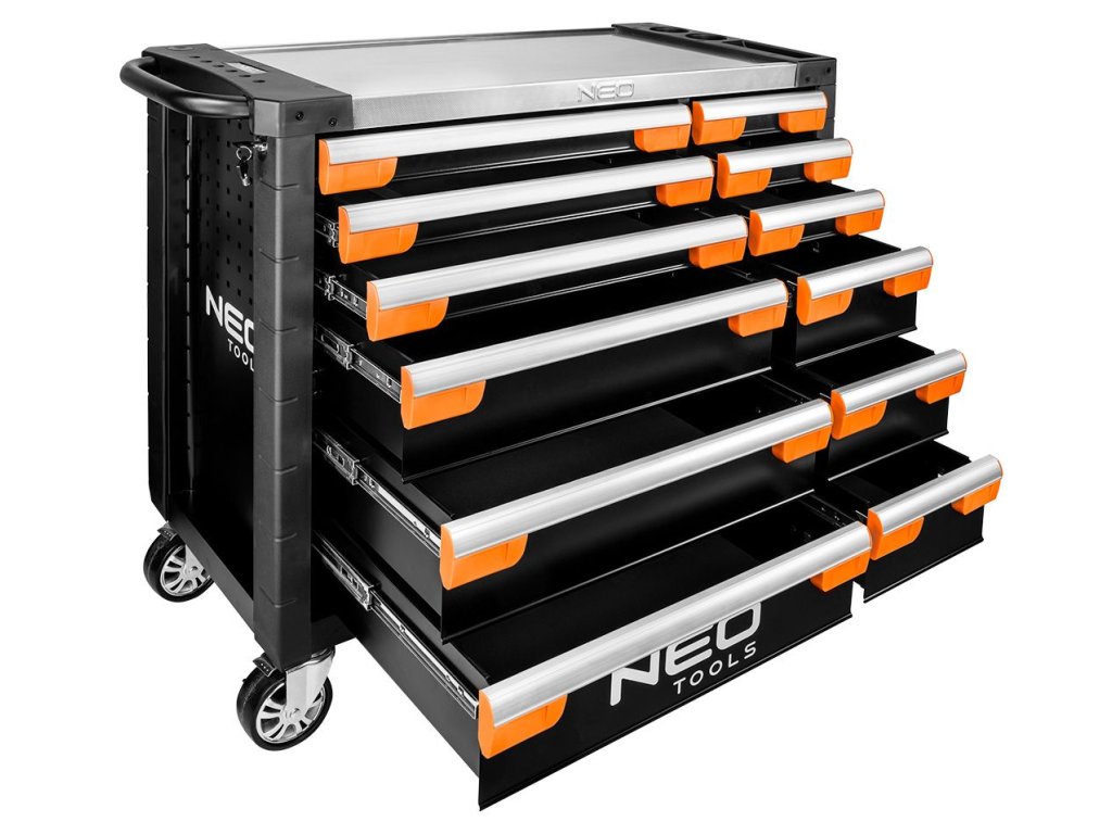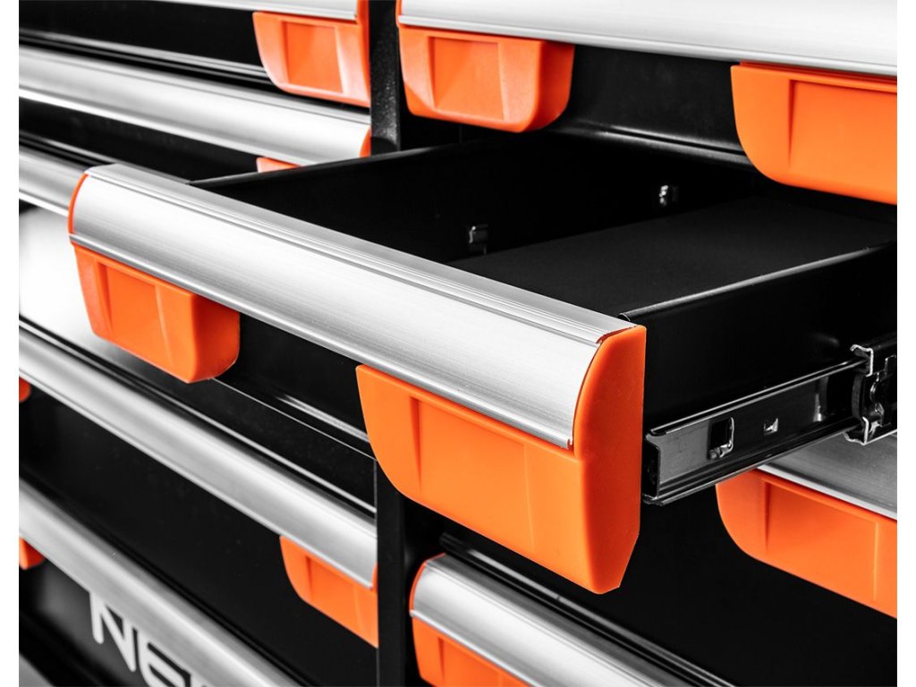 Interiér skrinky je zabezpečený rohovými nárazníkmi, zámkami zásuviek a centrálnym zamykaním (so sadou dvoch kľúčov). Guľôčkové ložiskové výsuvy, zásuvky s 100% otváraním, kompatibilné vložky na náradie NEO a 2 mm vysoké rohože z EVA robia produkt ľahko použiteľným. Bočná rukoväť a zámky koliesok umožňujú manévrovanie so skrinkou po dielni. Vlastnosti produktu: