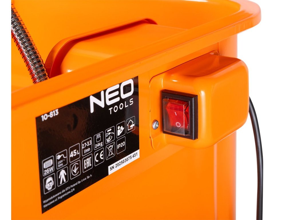 Umývačka NEO TOOLS je napájaná napätím 230 V/50 Hz a má flexibilnú hadicu s dĺžkou 615 mm pre jednoduché ovládanie prietoku kvapaliny. Jej robustná konštrukcia a stabilné nohy a polica zabezpečujú bezpečnú prevádzku. Je ideálnou voľbou pre mechanikov a domácich majstrov, ktorí hľadajú správne vybavenie do svojej dielne. Vlastnosti produktu: