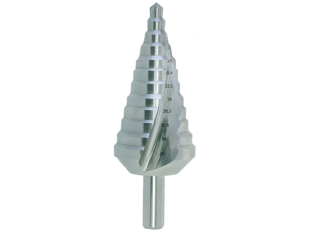 - Skrutkovitá drážka výrazne uľahčuje vyťahovanie stupňovitého vrtáka z vyvŕtaného otvoru.